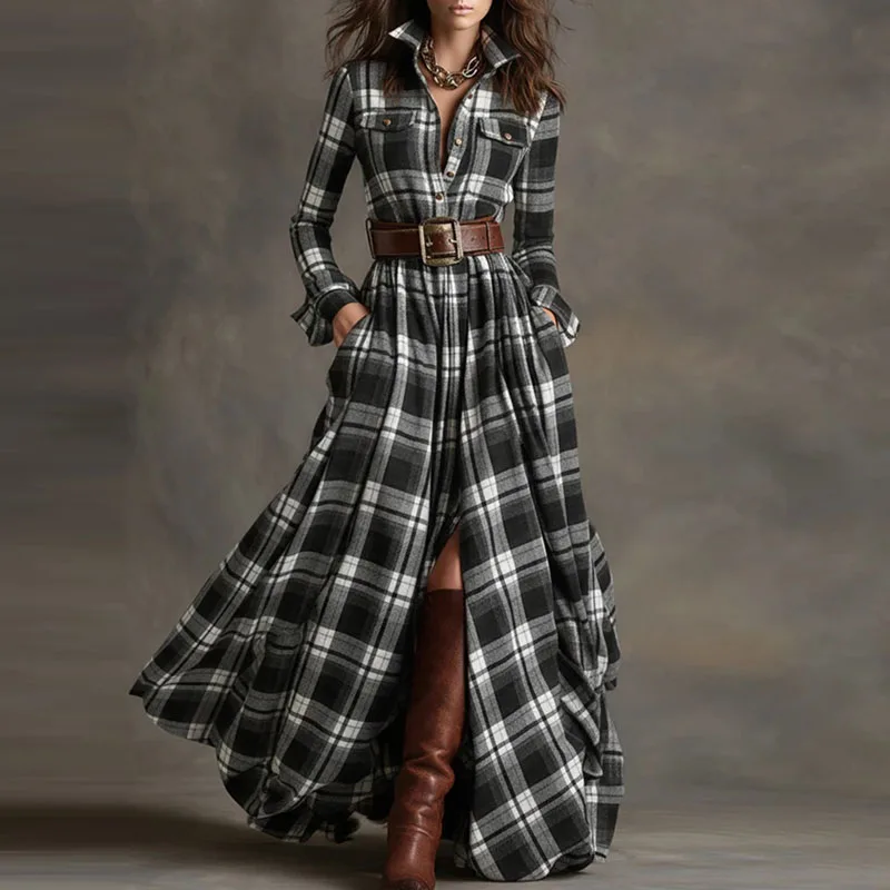 Boho Woman Clothing Elegant Shirt Collar Button Loose Long Dresses Retro New Plaid Print Pocket Swing Autumn Maxi Dress Vestidos