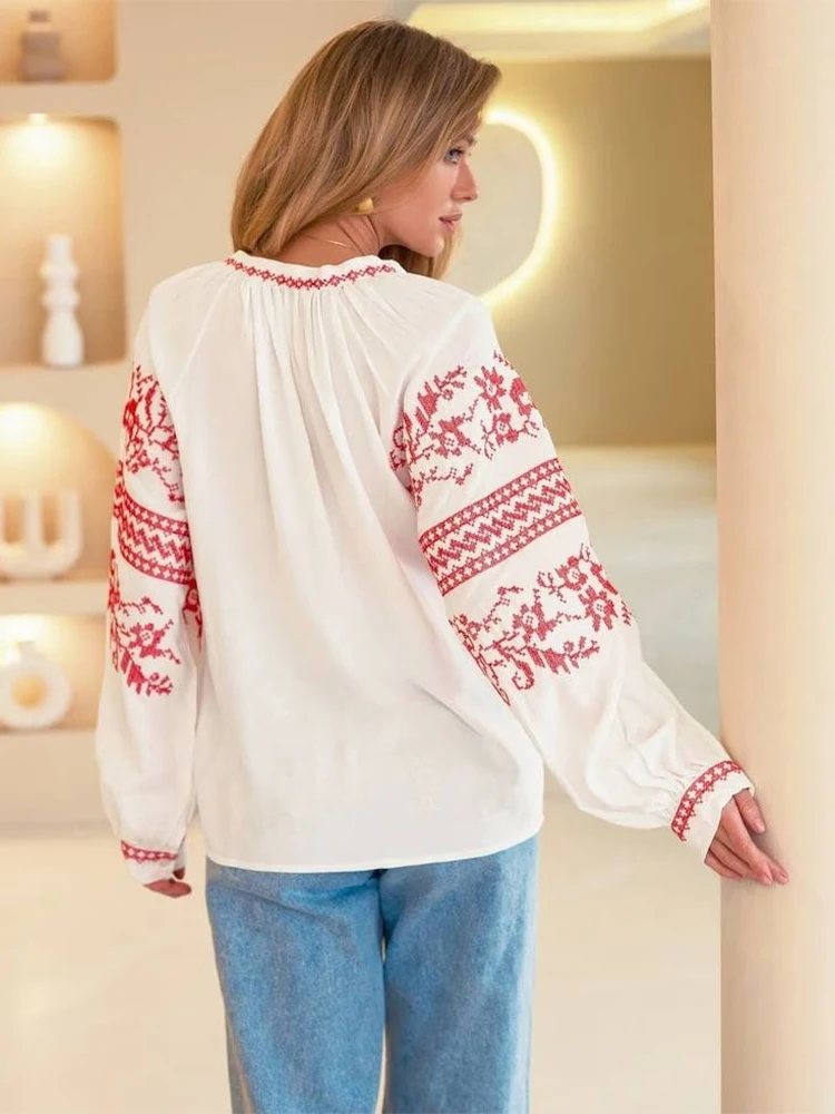 Boho Women's Retro Blouse National Style Print Lace-Up Tassel O-Neck Lantern Sleeve Tops Loose All-Match Female Blusa 2025