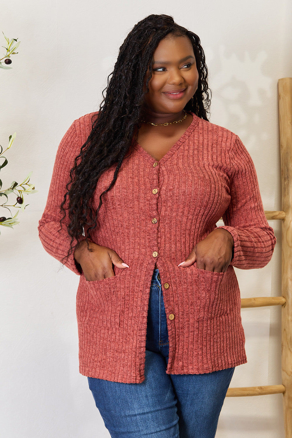Double Take Ribbed Button-Up Cardigan with Pockets