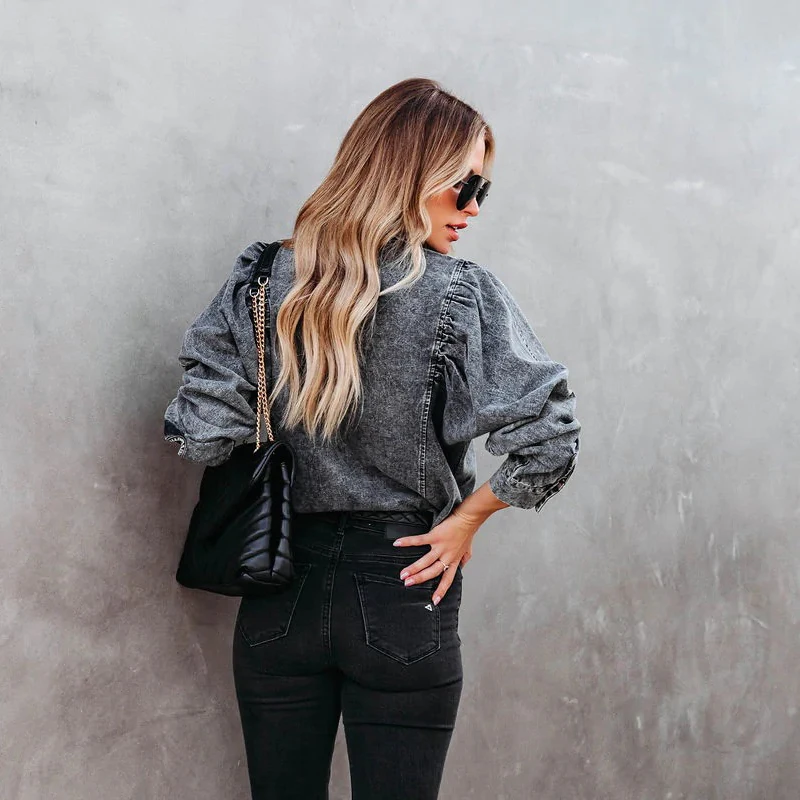 Girl Blouse Puff Long Sleeve Boho Denim Shirts Women Tops Vintage Cotton Blusas Casual 2023 Spring Autumn Loose Cowboy Shirt