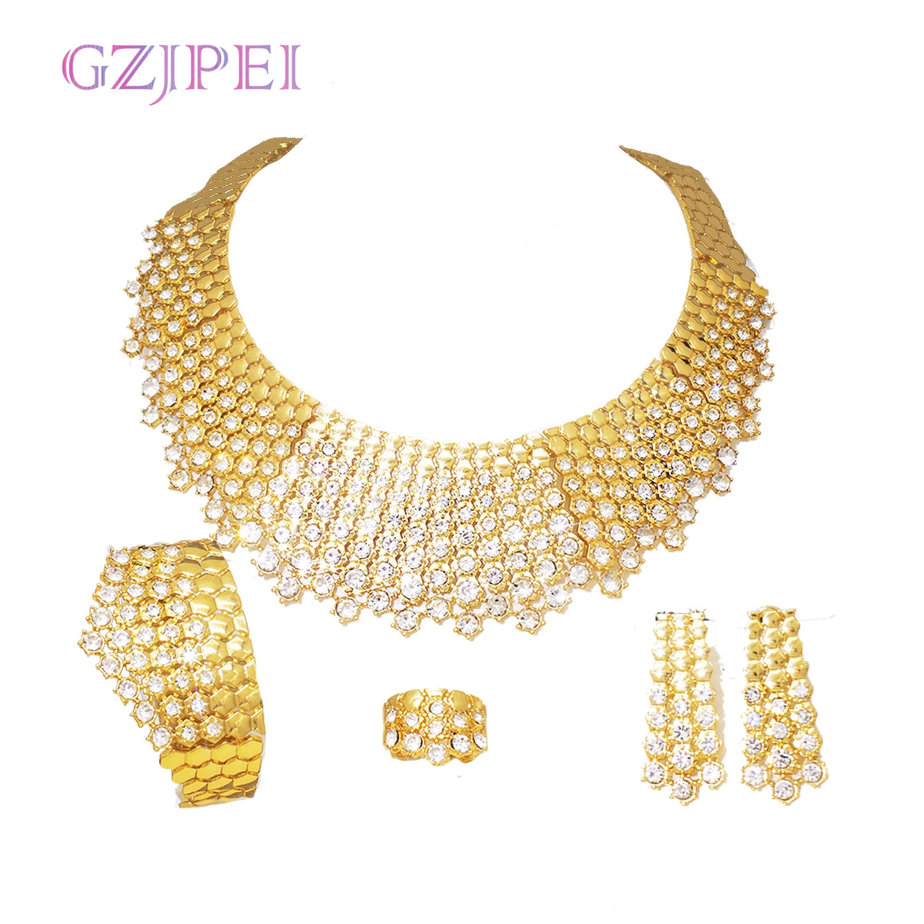 GZJPEI Shiny White Zircon Jewelry Set Italy Nigeria Wedding Jewellery 18K Gold Plated Big Necklace Bracelet Long Drop Earring