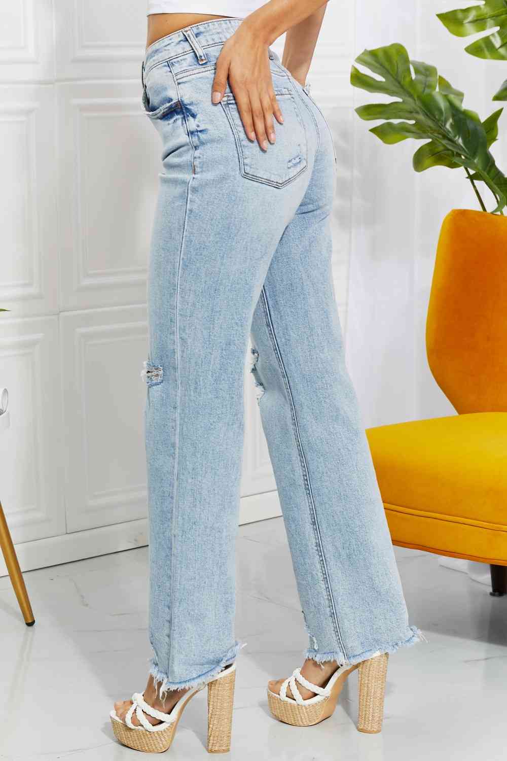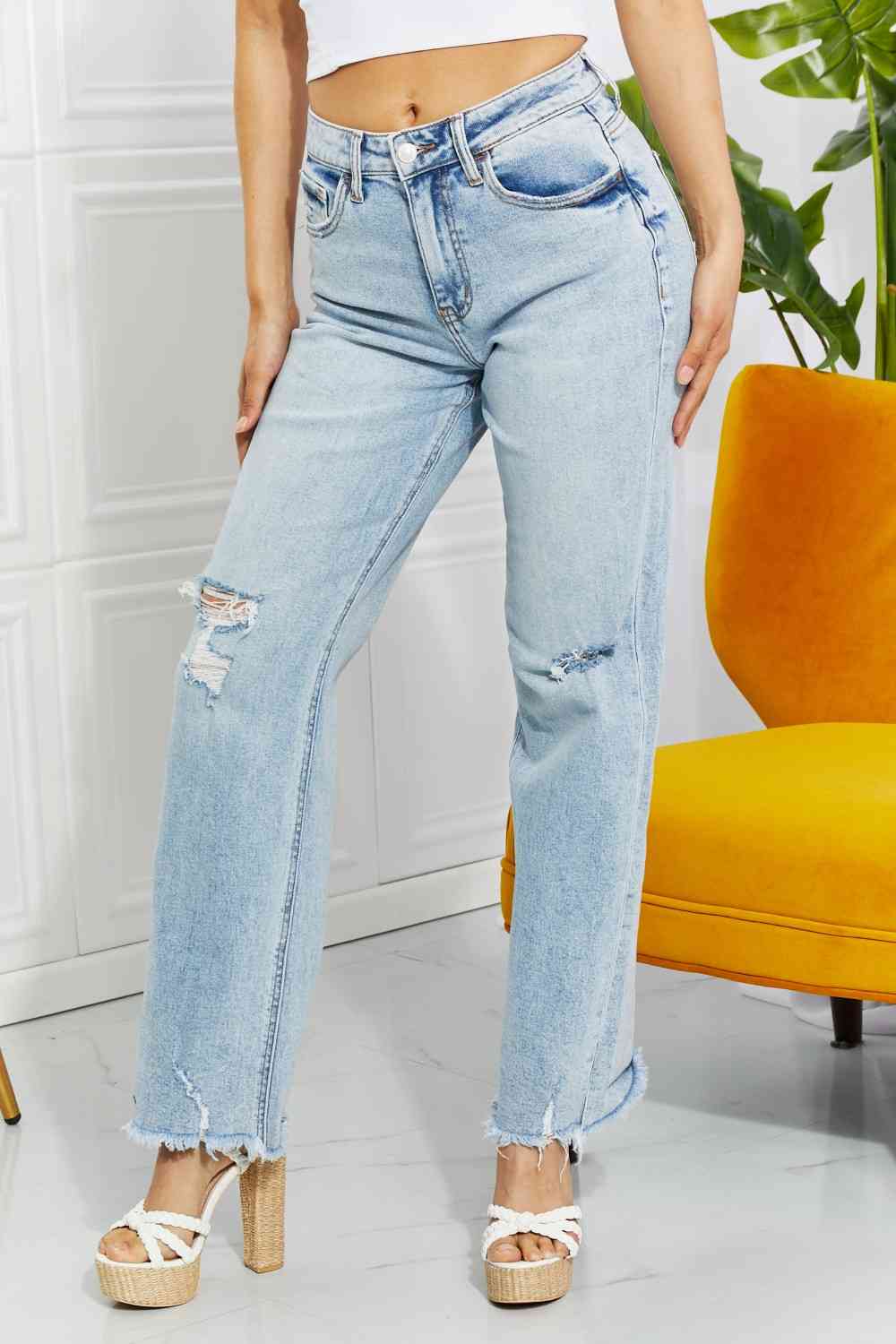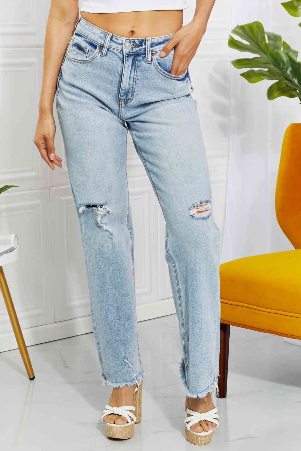 With a high waist, light wash, and distressed detailing, these straight cut jeans will take you right back to the 90's. We love the cat's whiskers fading on the thighs and the raw hem that give these jeans a well-loved look.