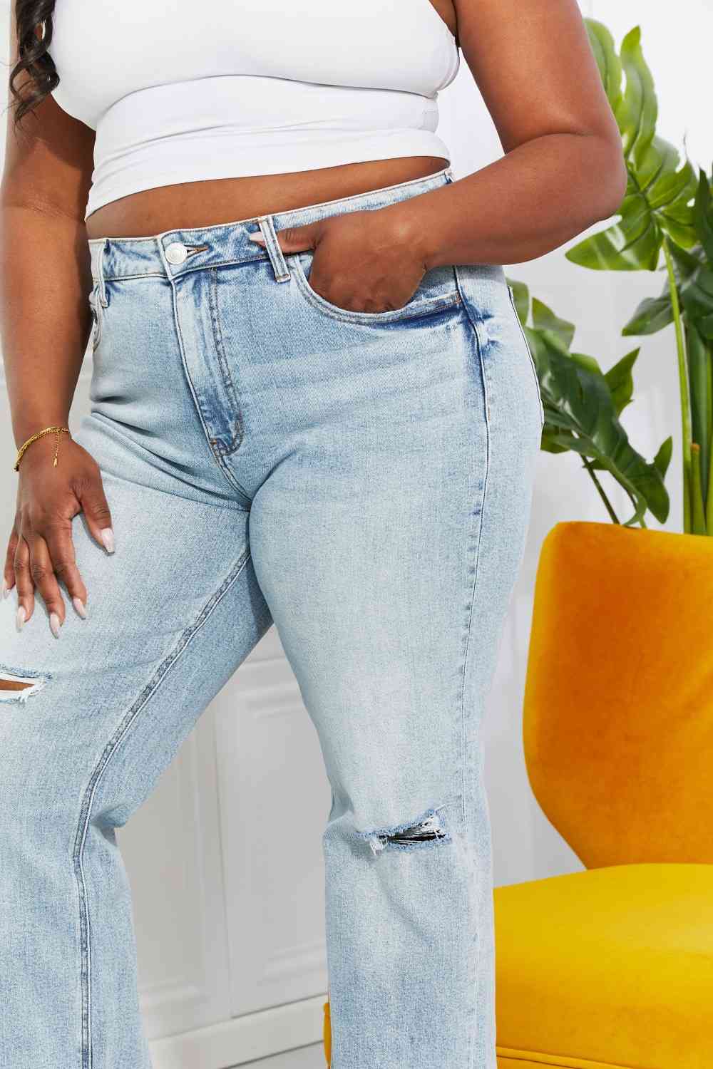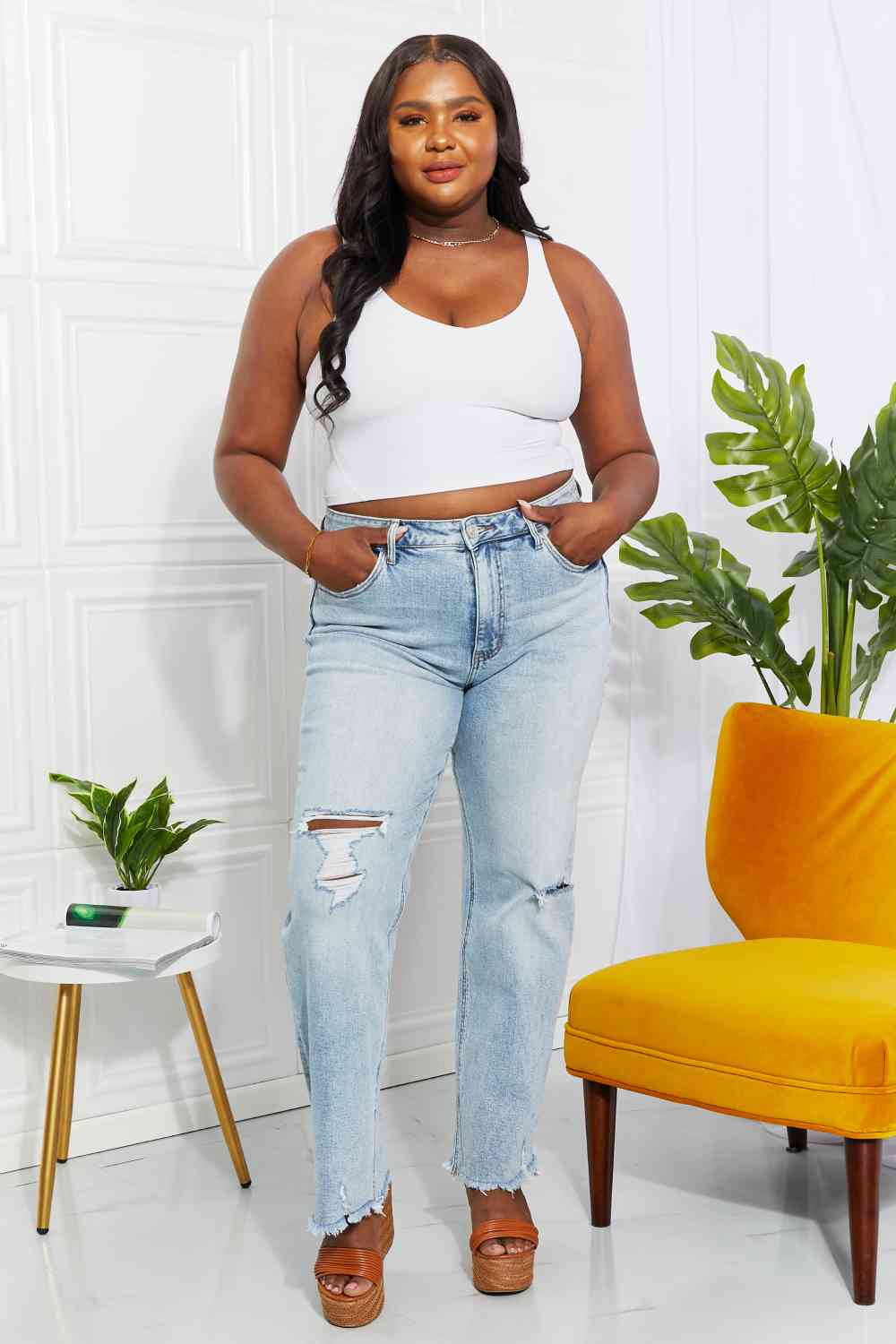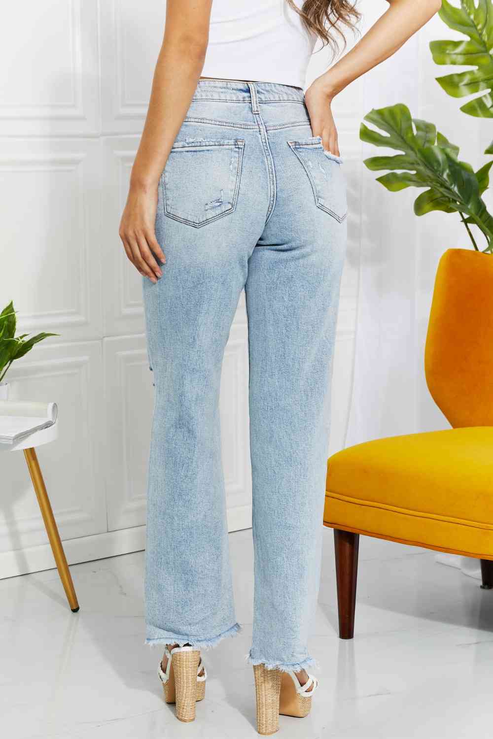 With a high waist, light wash, and distressed detailing, these straight cut jeans will take you right back to the 90's. We love the cat's whiskers fading on the thighs and the raw hem that give these jeans a well-loved look.