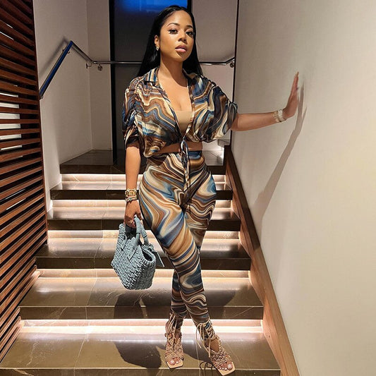2 Piece Set Abstract Print Sheer Mesh Outfits